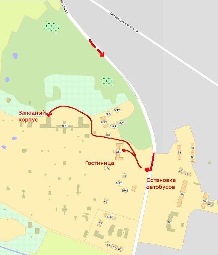 Доехав до остановки "Пулковская обсерватория", нужно выйти из автобуса и войти в ворота обсерватории. Зелёное здание с белыми колоннами, расположенное напротив ворот, - это гостиница обсерватории.